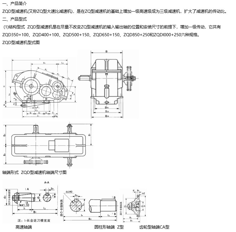 ZQD型減速機是在盡量不改變ZQ型減速機的輸入輸出軸的位置和安裝尺寸的前提下,增加一高速級稱為三級傳動,增加的高速級在上方。
