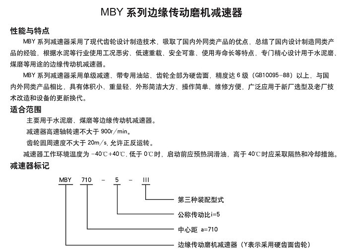MBY系列減速機采用了現代齒輪設計制造技術,吸取了德國、日本等同類產品的優點,總結了國內設計制造的同類產品的經驗,根據水泥等行業使用工況惡劣,低速重載,要求安全可靠、使用壽命長的特點,專門精心設計用于水泥磨、煤磨等用途的邊緣傳動機減速機。